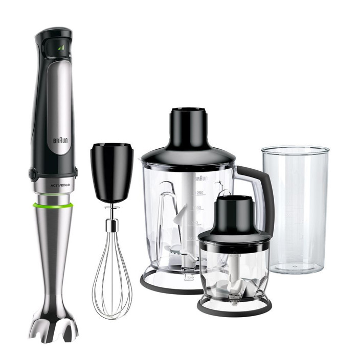 Для перемішування, подрібнення, збивання інгредієнтів можна використовувати різні побутові прилади або навіть змішувати все вручну. А можна просто купити занурювальний блендер Braun MQ 7045 X, який здатний повноцінно виконувати роботу міксера і часом виявляється більш зручним в роботі, ніж потужний кухонний комбайн. Секрет простий і полягає в комплектації: металевий широкий віночок, два універсальні подрібнювачі (1,25 і 0,35 л.) до стандартної фірмової блендерної ніжки з технологією ActiveBlade.