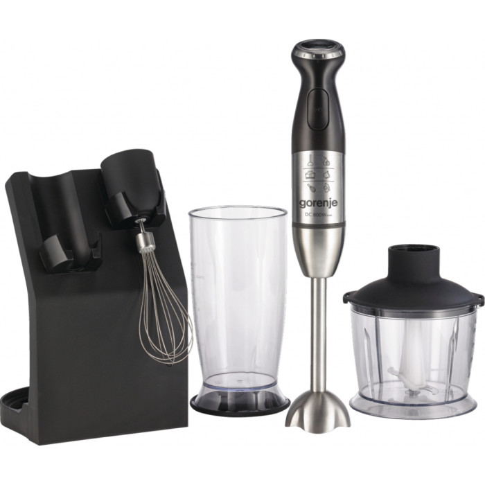 Розширена комплектація блендера Gorenje HBC807QB включає в себе безпосередньо блендер з металевою ногою, мірний стакан, міні-подрібнювач з чашею, насадку для збивання (віночок), а також оригінальну підставку, на якій можна зберігати аксесуари.