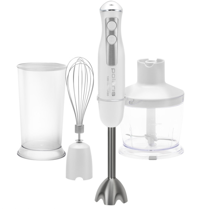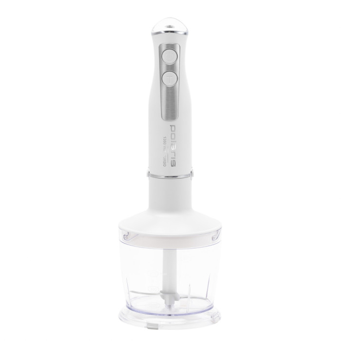 Управління блендером Polaris PHB 1385 зроблено дуже зручно. Виробник зважив на той момент, що прилад завжди тримають однією рукою, а другою потрібно притримувати ємність. Тому всі елементи зосереджені для керування однією рукою. Кнопка включення та ТУРБО знаходяться навіть на дотик. А на верхній частині є регулятор обертів з плавним регулюванням, що дозволить дуже гнучко проводити процеси навіть з вибагливими компонентами.
