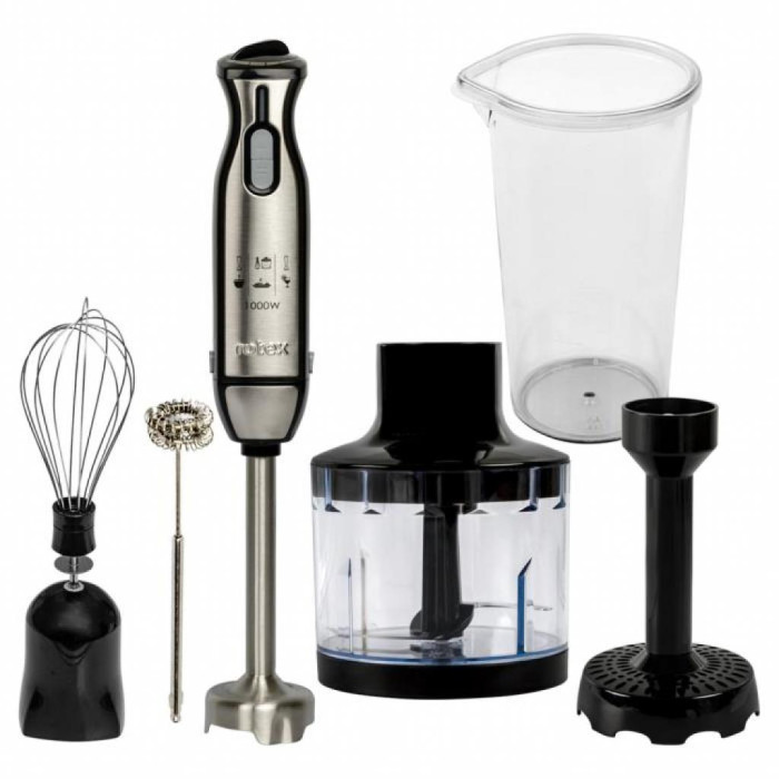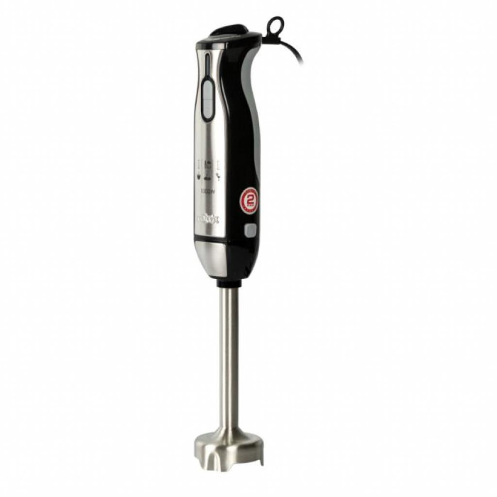 Живлення - 220-240В, 50Гц., Потужність 1000 Вт. 2 швидкісних режиму роботи. Регулятор швидкості на корпусі. Ножі чотирипелюсткові з нержавіючої сталі. Пластиковий корпус зі знімною ногою. Нога з нержавіючої сталі. Підвісна петля. Аксесуари: чаша з подрібнювачем 400 мл, мірний стакан 0,6 л, віночок з нержавіючої сталі, насадка для пюре, вспінювач молока.