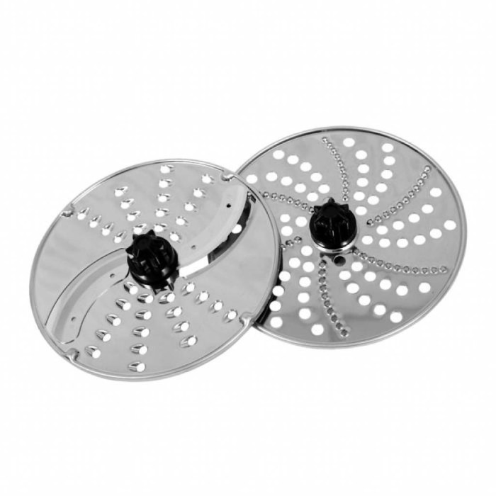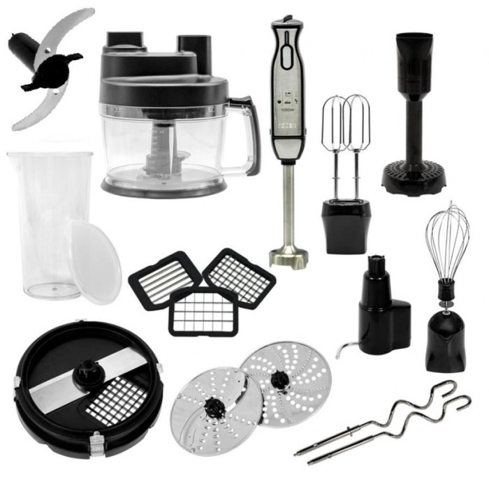 Крім цього, в даній моделі представлена багата комплектація аксесуарів, включаючи дві пластикові чаші, об'ємом 2,0 і 0,4 л, 0,6 л мірний стакан, ніжку з нержавіючої сталі, ніж для подрібнення, два вінчика для збивання і три насадки для замісу тіста, терки, шинкування, дві насадки для нарізки кубиками, насадка для приготування пюре і насадку для колки льоду.