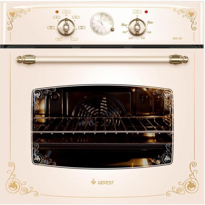 Об'єм внутрішньої камери дорівнює 52 л. Важливо відзначити, що вона оснащена системою підсвічування. Gefest ДА 602-02 має інтуїтивну панель управління, представлену механічними ручками вибору температури та режиму нагрівання. Доповнена вона і цифровим дисплеєм червоного світіння з сенсорними кнопками, які дозволяють встановлювати таймер. Серед іншого в даній моделі важливо відзначити наявність турбо-гриля, вертіла з електроприводом і конвекції.