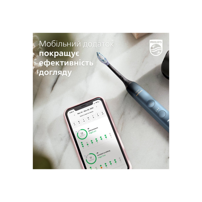 Зробіть посмішку яскравішою з передовою технологією Sonicare. Щетинки усувають на 100% більше плям, ніж ручна зубна щітка, забезпечуючи помітно біліші зуби