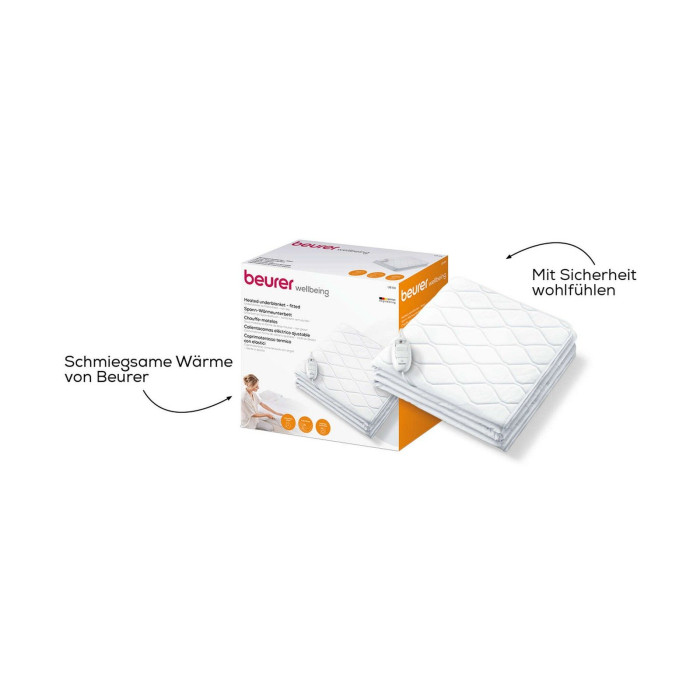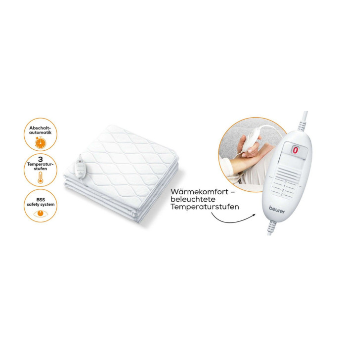 Beurer UB 64 - Повністю укомплектована ковдра з підігрівом: заспокійливе тепло з повністю укомплектованою ковдрою з підігрівом UB 64 від Beurer. Зручне керування 3 температурними режимами дозволяє індивідуально налаштувати тепло для обіймів. Для Вашої безпеки ковдра, що підігрівається, оснащена підсвічуванням функціонального дисплея, перевіреною системою безпеки BSS Beurer і функцією автоматичного відключення через 3 години. Верхня частина ковдри, що підігрівається, виконана з комфортної бавовни, а нижня - з дихаючого флісу