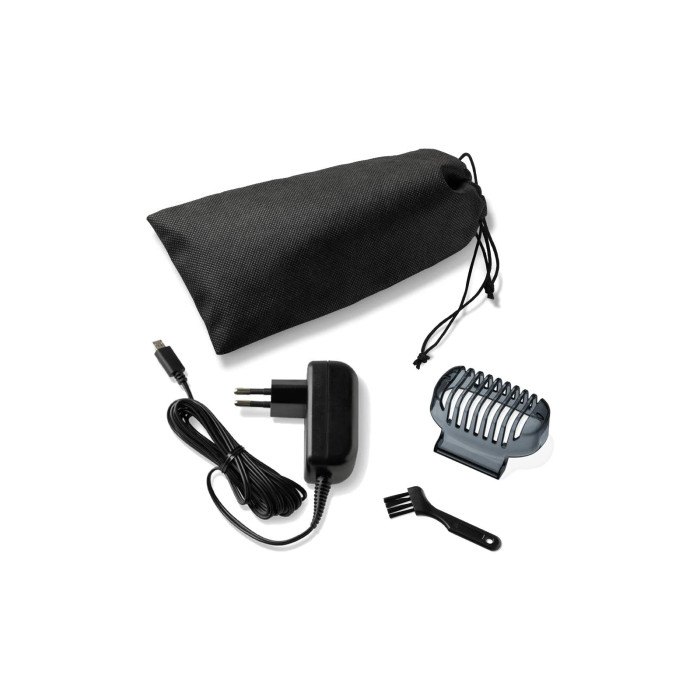 Все необхідне для комфортного використання: У комплекті — захисний ковпачок/триденна насадка для бороди, пензлик для очищення, сумка для зберігання, адаптер живлення.