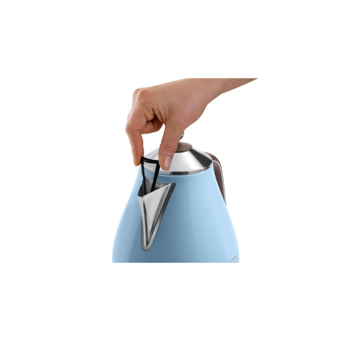 Електрочайник DELONGHI KBOV2001 дизайнерської серії Vintage Icona стане прикрасою вашої кухні. Незвичайна, пінгвінообразна форма виглядає витончено і привабливо. Прилад прикрасить вашу кухню і буде довго радувати погляд. Металевий корпус має блакитне покриття. Прикрашений в нижній частині вузьким хромованим пояском.
