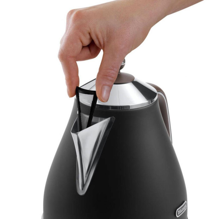 Прилад Delonghi KBOV2001 забезпечений клювоподібним витягнутим носиком, який не розливає рідина при наливанні. Чорною ручкою з верхнім кріпленням зручно переносити чайник і користуватися ним. Нагрівальний елемент виконаний прихованим, дискового типу. Перешкоджає накопиченню накипу і швидко нагріє воду. Безпечне використання реалізовано на трьох рівнях.