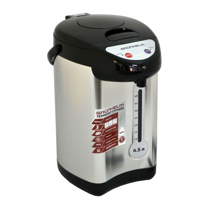 Grunhelm GTP450S - потужний, надійний електричний термопот з корпусом з міцного пластику і нержавіючої сталі. Маючи потужність 900Вт, він за кілька хвилин закип'ятити воду об'ємом до 4.5 л. Пристрій не тільки кип'ятить воду, але і підтримує її температуру, що економить час і електроенергію на нагрів води з початку. Є шкала рівня води і світловий індикатор включення, а так само блокування від включення Сушка для без води. Внутрішня поверхня виготовлена з харчової нержавіючої сталі. Grunhelm GTP450S має зручну ручку для транспортування і три способи дозування води, за допомогою електричної помпи, сенсорного склянки або ручного насоса.