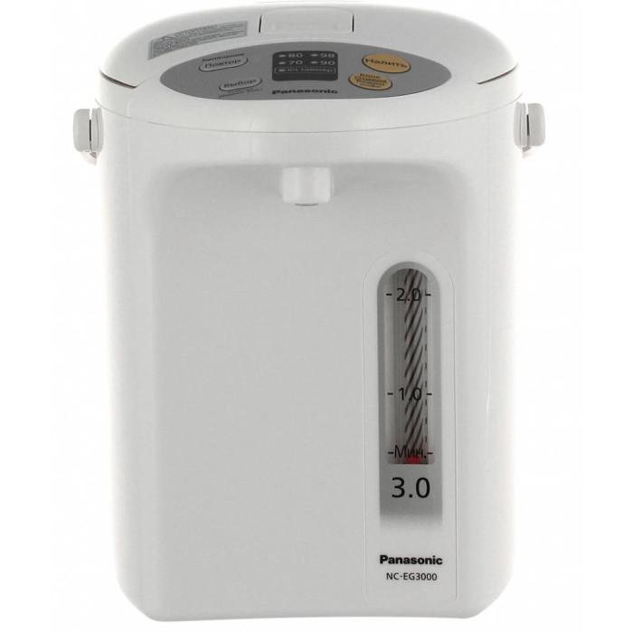 Електрочайник PANASONIC NC-EG3000WTS - термопот, який здатний підтримувати воду гарячої протягом тривалого часу без істотного витрати енергії. У цій моделі використаний енергозберігаючий таймер з налаштуванням часу (до 6 годин), передбачена система термоізоляції U-VIP.
