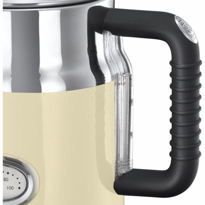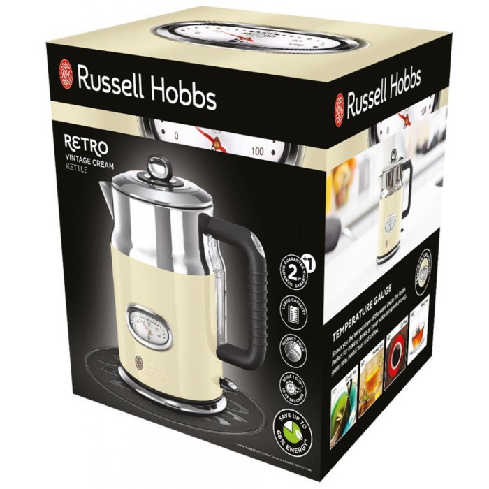 Кремовий чайник Vintage Cream входить в колекцію приладів для сніданків Retro, яка включає в себе ще тостер і кавоварку. Елегантний ретро дизайн чайника Vintage Cream чудово поєднує в собі сучасні технології і привабливий зовнішній вигляд. Корпус виконаний з хромованої нержавіючої сталі. Бархатиста прогумована ручка прикрашена стильним вензелем Russell Hobbs.