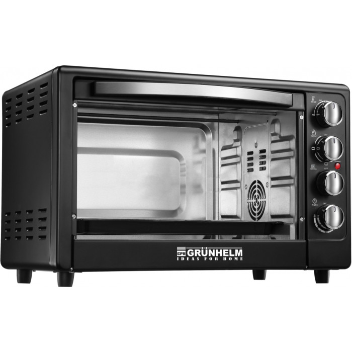 Електрична піч Grunhelm GN50AC має вельми об'ємну камеру, яка здатна вмістити в себе великі страви - 50 л. Загальний дизайн ергономічно продуманий і залишається класичним, тому впровадити таку піч на кухню буде нескладно. Габарити корпусу 41 x 58.3 x 37 см. Оформлення в чорному кольорі з хромованими елементами - базовий варіант, який вітається в будь-якій кухні. Механічні регулятори управління представлені чотирма поворотними перемикачами, які мають зрозумілий інтерфейс.