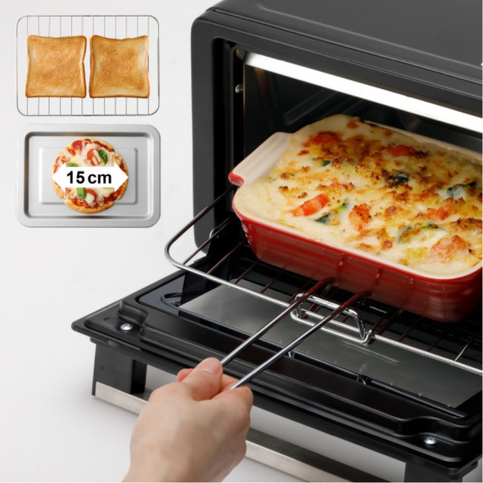 Компактна зовні, містка всерединіКомпактні розміри дозволяють легко розмістити піч на будь-якій кухні. Об'єм 9 літрів ідеально підходить для швидкого приготування страв, наприклад спекти піцу або підсмажити 2 скибочки хліба за один раз.