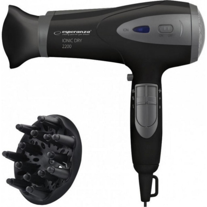 Фен Esperanza Hair Dryer EBH005K створений для побутового застосування. Він має потужність 2200 Вт, що дозволить вам швидко і практично з професійним підходом обробити волосся будь-якої структури. Ергономіка корпусу покликана полегшити використання техніки, тому що фен має зручну чіпку рукоять, зрозумілі і надійні елементи управління, розширений функціонал, який відрізняє його від більшої частини пристроїв, запропонованих на ринку в даному сегменті.