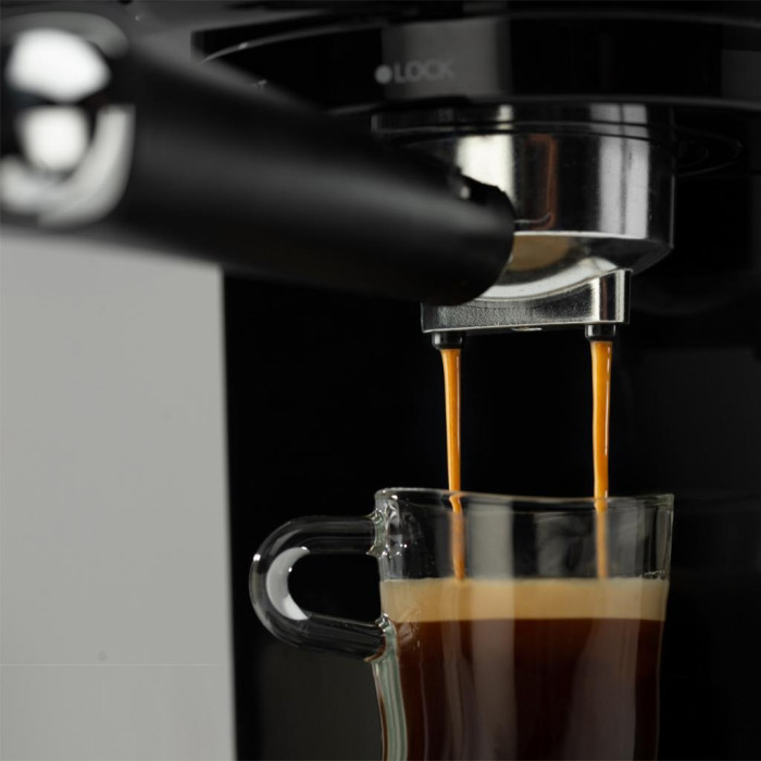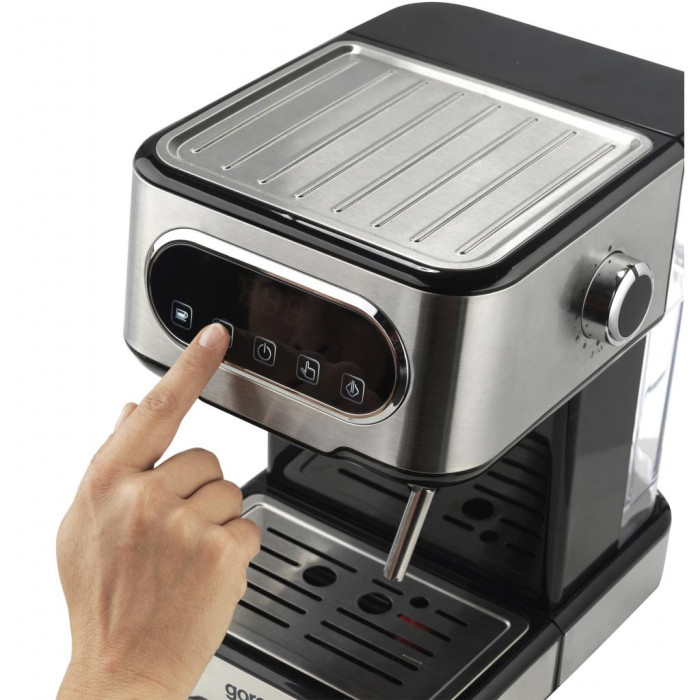 Кавоварка еспресо Gorenje ESCM15DBK зроблена з нержавіючої сталі, об'ємом 1,5 л і потужністю 1100 Вт.