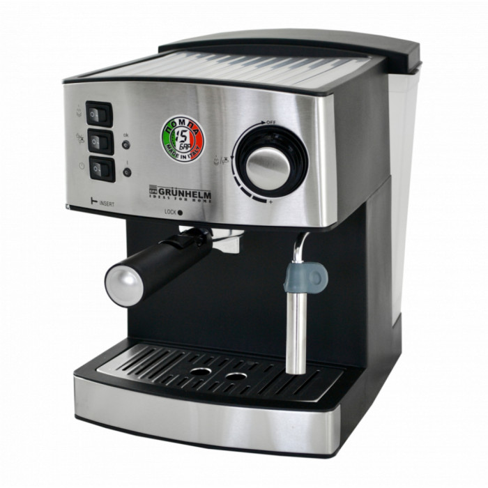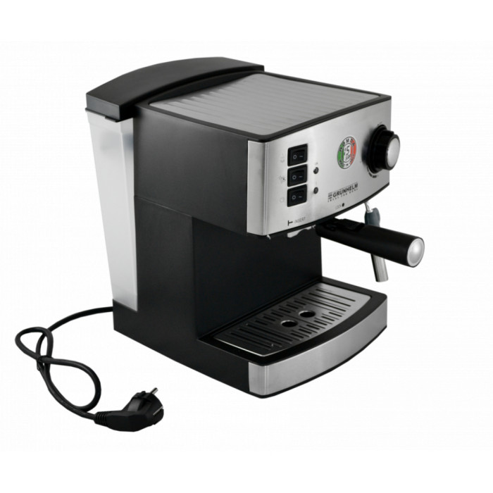 Кавомашина Grunhelm GEC15 не буде вибиватися із загальної концепції дизайну кухні або офісу. Універсальне поєднання чорного кольору і металевих деталей робить її одночасно індивідуально вираженою але не занадто яскравою. Скромні габарити і вага сприяють розміщенню на обмеженій площі.