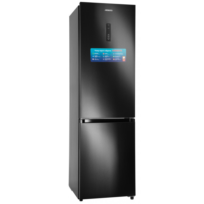 Двокамерний холодильник чорного кольору зі скляним фасадом заввишки 201,8 см із нижньою морозильною камерою та LED-підсвічуванням. Призначений для використання в побутових умовах, в офісах, заміських будинках, інших житлових приміщеннях та кухонних зонах магазинів. Об’єм холодильної камери – 256 л, морозильної – 122 л. Клас енергозбереження – А+.