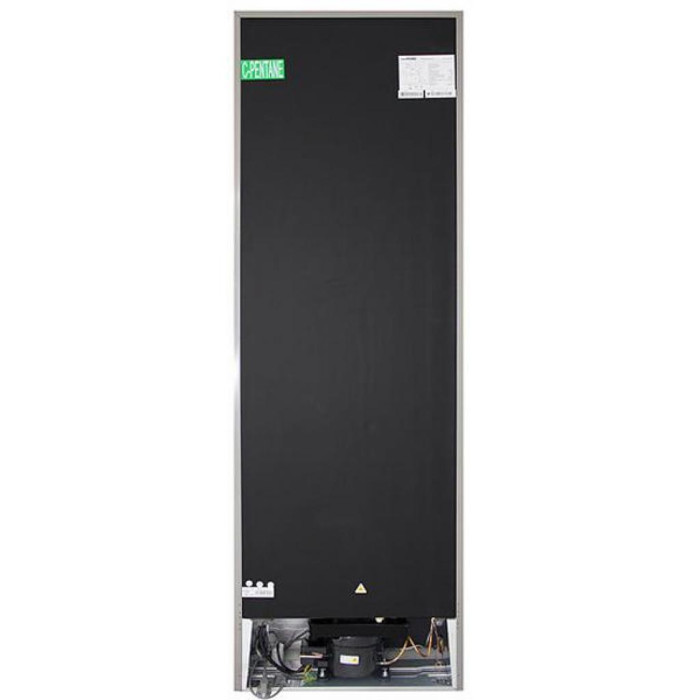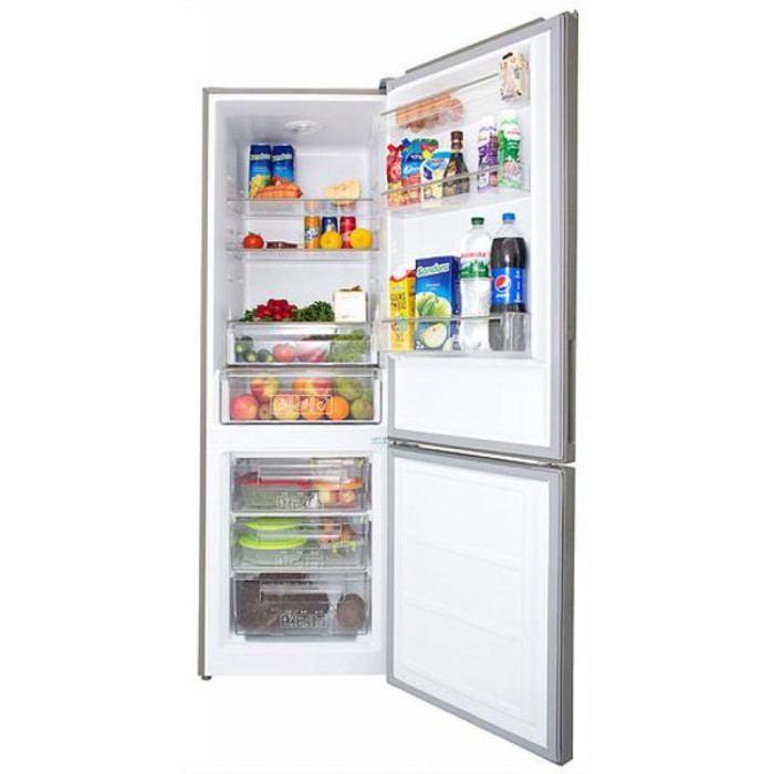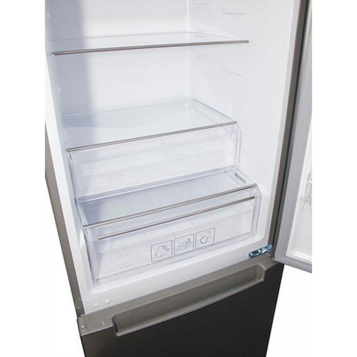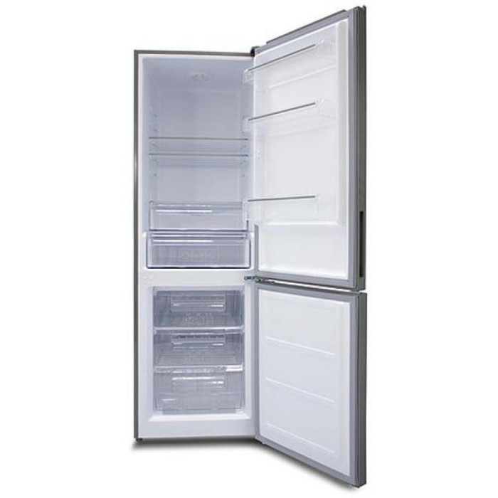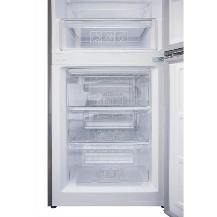 Двокамерний холодильник RFS 1801 MX від бренду Prime Technics з нижньою морозильною камерою, механічним управлінням і крапельною системою розморожування.