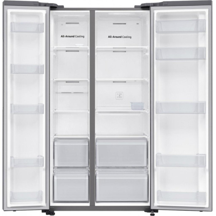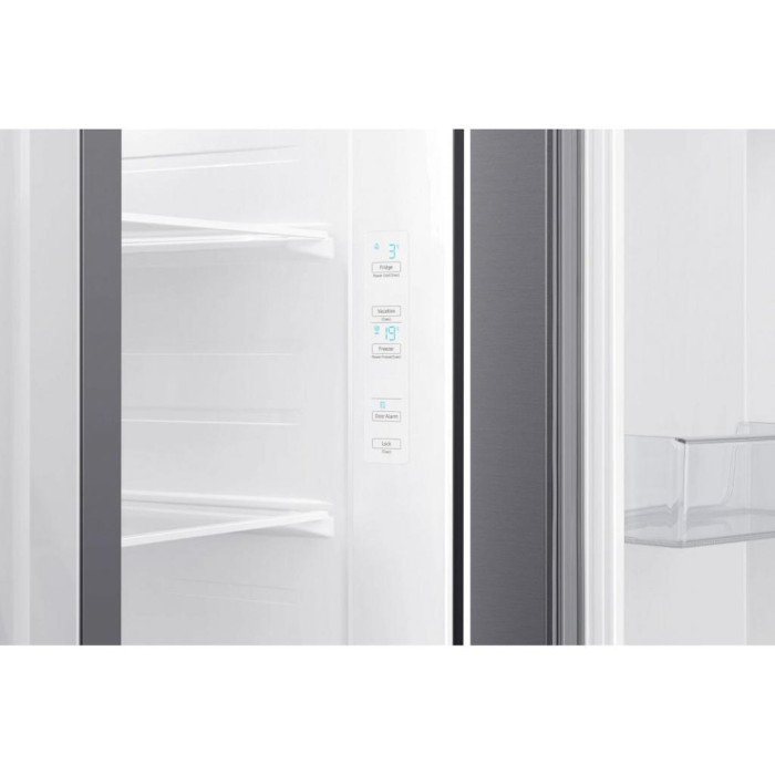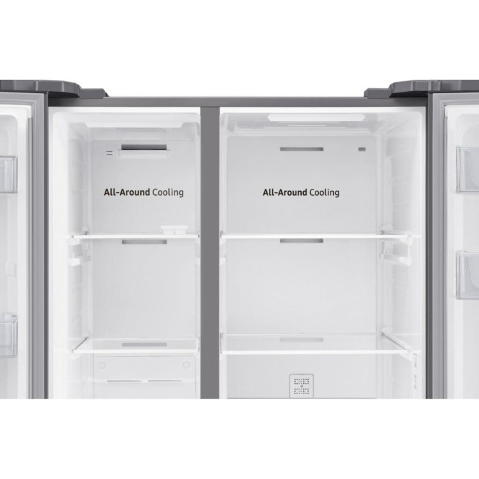 Зберігайте більше продуктів з великим об'ємом 617 л. Унікальна технологія SpaceMax TM в холодильнику Samsung RS61R5001M9/UA дозволяє зменшити товщину стін, оскільки використовує мінімальну кількість високоефективної ізоляції. Таким чином, вона створює більше місця для зберігання без збільшення зовнішніх розмірів і зниження енергоефективності.