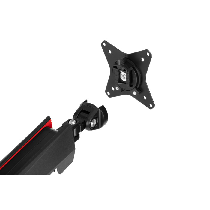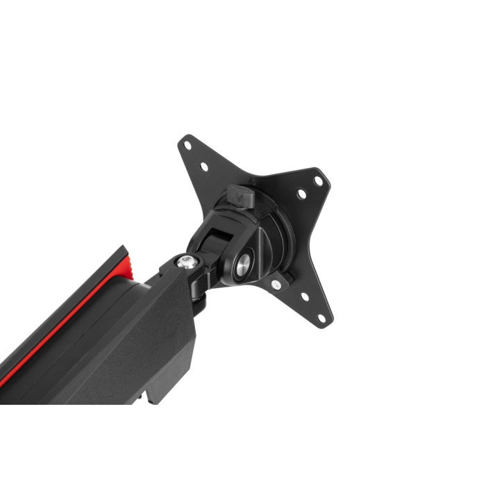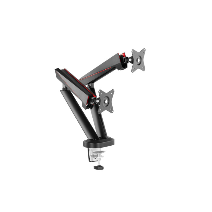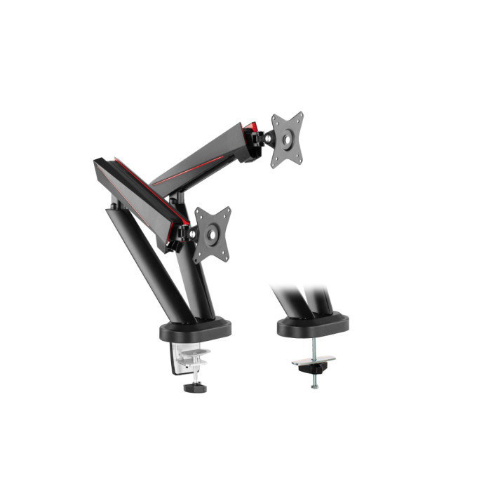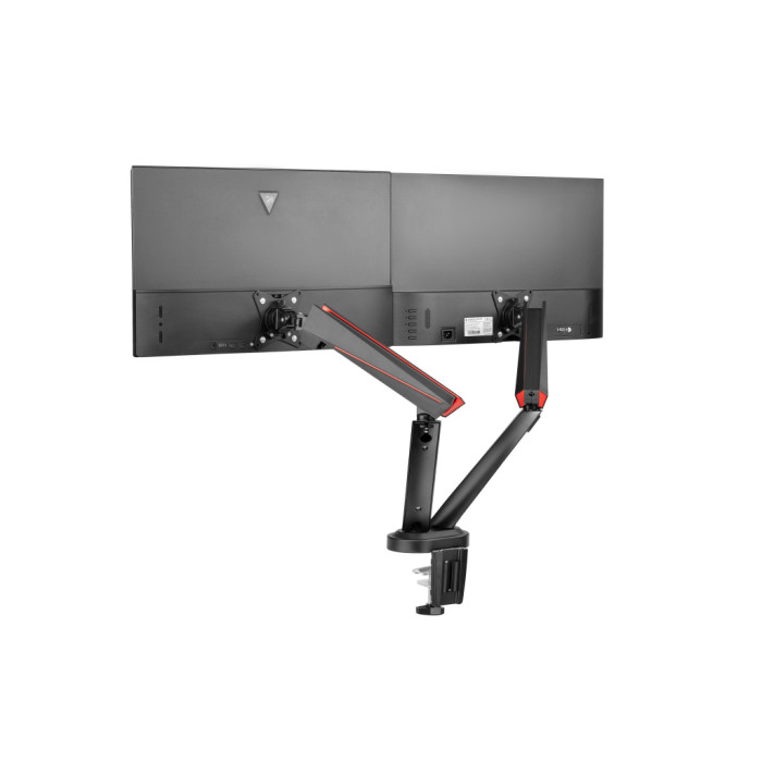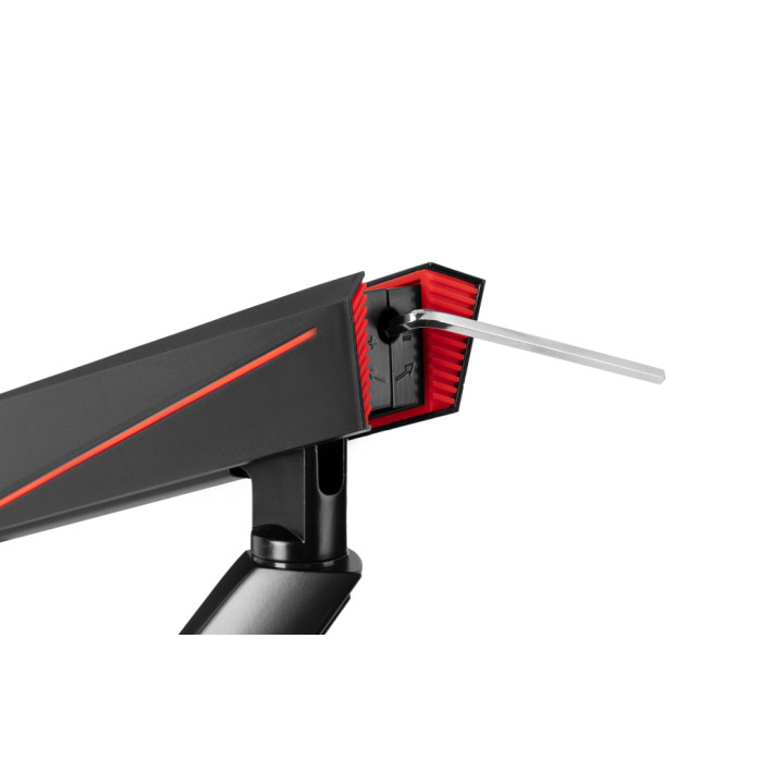 Підставка для двох моніторів чорного кольору з червоними вставками. Дизайн продовжує кіберспортивний дух 2E Gaming – тож запекла битва у грі чи просто ефективне виконання робочих завдань точно будуть під контролем!