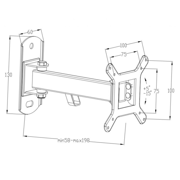 VESA 75 x 75, 100 x 100 Відстань до стіни 58-198 мм Варіанти встановлення на стіну Виробник Vinga Гарантія від виробника 60 Кількість ступенів свободи 2 Код товару U0219642 Колір чорний Комплектація інструкція, елементи кріплення Кут нахилу/повороту 5/15/180 Всі характеристики