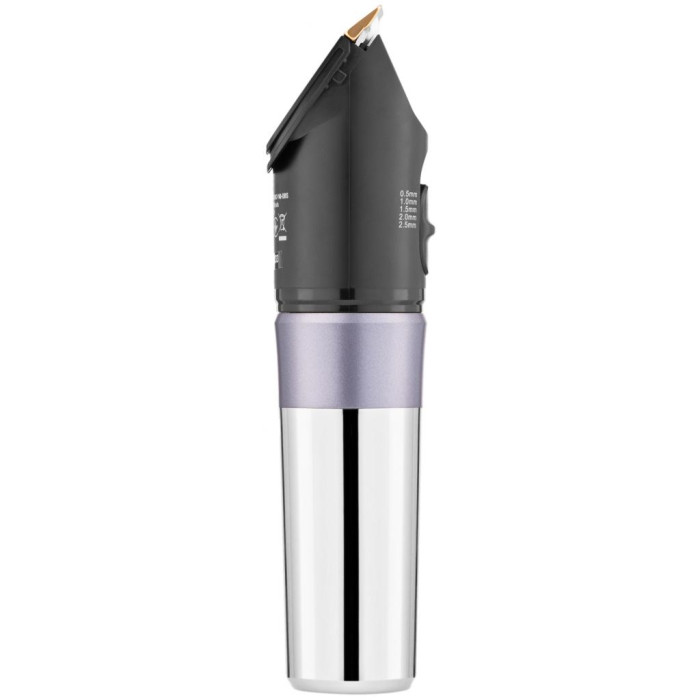 Компактна машинка для підстригання волосся з керамічним лезом, вбудованим акумулятором, LED-дисплеєм та комплектом насадок. Корпус виконано з пластику чорного кольору та доповнено хромованою ручкою. Машинка підтримує регулювання довжини підстригання без використання насадок, а для зручного зберігання передбачена підставка з можливістю підзарядки.