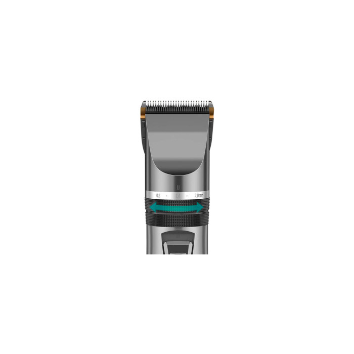 Машинка оснащена керамічними лезами з покриттям титану, які самозаточуються в процесі роботи. Це надійна система довгої служби пристрою. На корпусі нижче передбачений поворотний механізм для налаштування рівня лез. Крім стрижки волосся на голові, машинкою можна підрівняти бороду та бакенбарди.