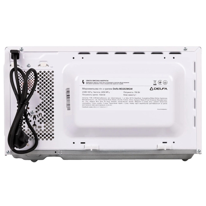 Догляд за СВЧ-піччю. Корпус Delfa MD202MGW покритий емаллю білого кольору, на якій не залишаються відбитки пальців. Внутрішня поверхня також покрита стійкою до забруднень емаллю. Вона легко очищається за допомогою мильної води і нежорсткої губки.