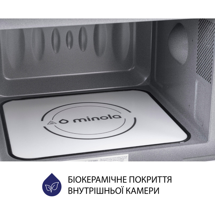 Внутрішня камера моделі Minola BWO 2022 SS має об'єм 20 л. Продукти розташовуються не на тарілці, що обертається, а на нерухомій біокерамічній панелі. Це дозволяє поміщати в мікрохвильову піч страви в посуді будь-якої форми. Відсутність поворотного столу забезпечує ідеально рівну поверхню, на якій не буде накопичуватися бруд та жир. Завдяки цьому догляд за мікрохвильовою піччю буде швидким і легким.