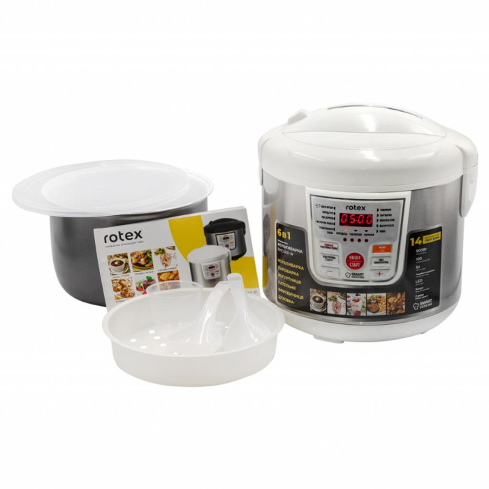 Працює Rotex RMC508-W при підключенні до звичайної електромережі через шнур завдовжки 1,2 м. Якщо говорити про додаткові можливості техніки, тут варто відзначити наявність функції підтримання тепла і таймер відстрочки. Завдяки останньому процес приготування можна перенести на 24 год. В упаковці товару присутні пластиковий контейнер для варіння на пару, ложка з ополоником, мірний стаканчик і книга з сотнею рецептів.