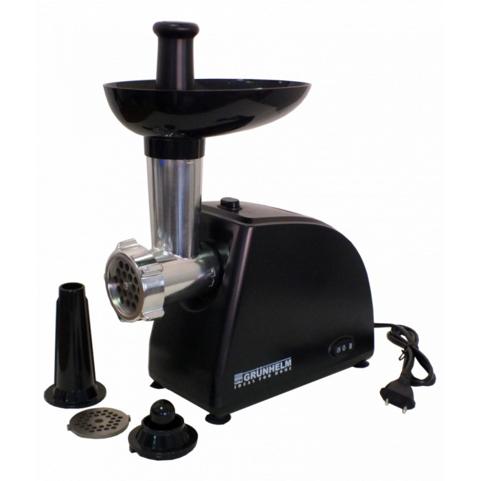 Проста компактна модель м'ясорубки Grunhelm AMG140B з ручкою має потужність 1400 Вт. Володіє низьким рівнем шуму для комфортної роботи. Для зручності користування має нековзаючі гумові ніжки. Діаметр камери м'ясорубки 54 мм. У комплекті 2 решітки для фаршу 5 і 7 мм, а також насадка-кеббе та насадка для приготування ковбас.