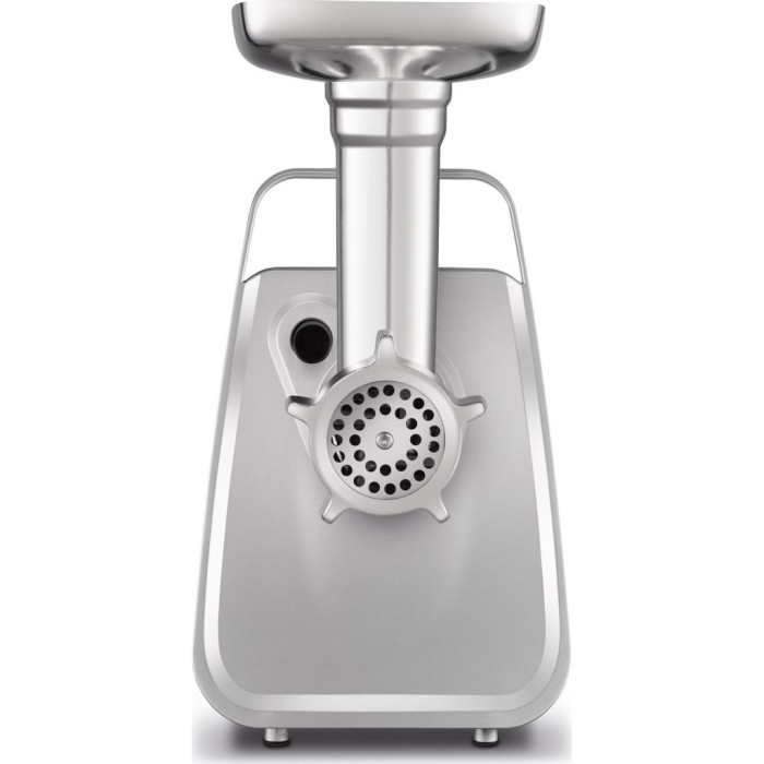 Для цього м'ясорубка оснащена 6 робочими насадками, включаючи 3 перфорованих диска для дрібного, середнього і великого подрібнення, 2 барабана для натирання і шинкування, а також універсальною насадкою для наповнення ковбасок.