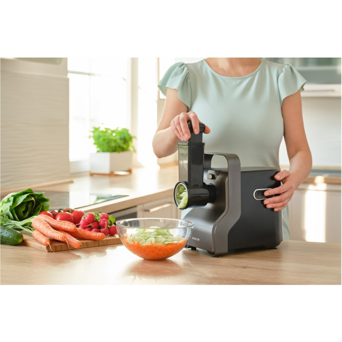 М'ясорубка Sencor - пристрій зі споживаною потужністю 2100 Вт, який здатний обробляти продукцію зі швидкістю 1,7 кг за хвилину. Вона обладнана трьома решітками для різних типів м'яса та додатковими насадками для ковбаси та кеббе. В комплекті також надаються чотири терки для різноманітної обробки продуктів. Корпус м'ясорубки виготовлений з міцного пластику та металу, надаючи їй надійність та довговічність. Її стильний чорний дизайн робить її не лише функціональним, але й естетичним елементом кухонного інтер'єру