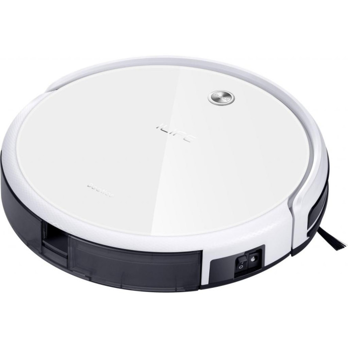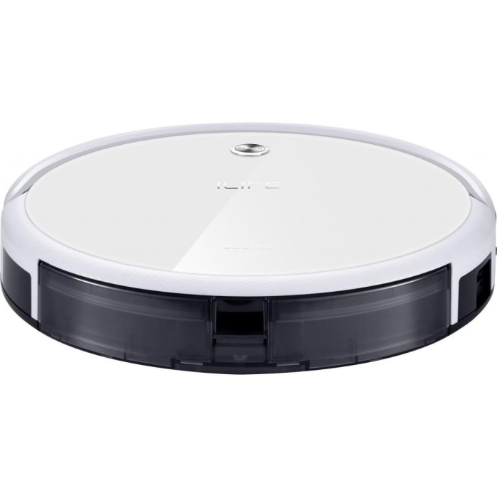 ILIFE A40 виглядає стильно і футуристично: білий глянцевий корпус з загартованого скла, дві бічні щітки і єдина кнопка на передній панелі — для включення робота. Під час роботи вона підсвічується колірним індикатором. Розміри пилососа — діаметр 31 см, висота 76 мм — дозволяють йому без проблем переміщатися під меблями і прибирати в тих місцях, де зазвичай нам лінь: за диваном, під ліжком чи під ванною.