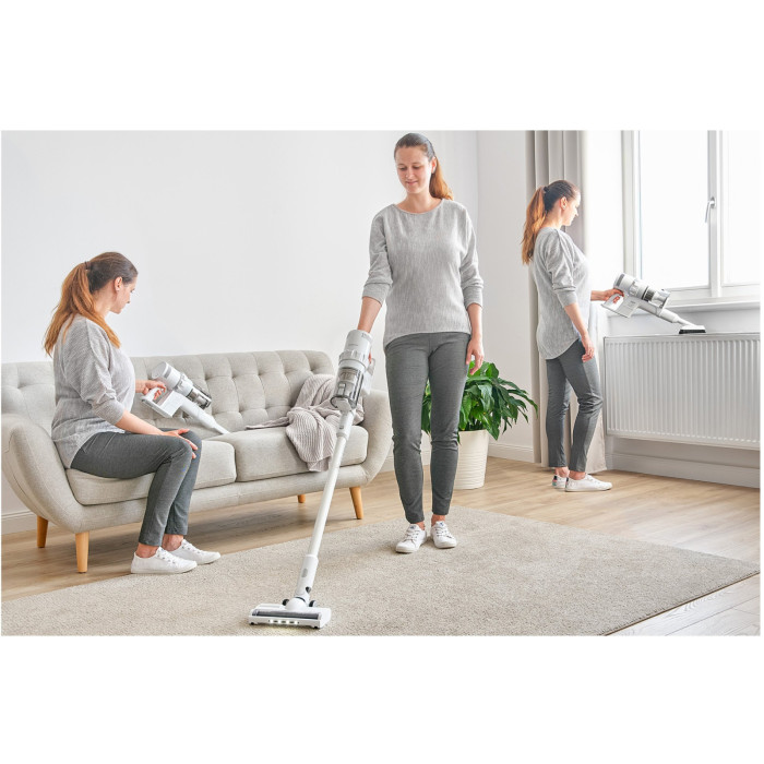 Акумуляторний вертикальний пилосос 2 в 1 - це чудовий помічник для простого та досконалого прибирання. Він обладнаний цифровим двигуном з потужністю 250 Вт, який гарантує відмінні результати прибирання для всіх типів поверхонь. Він легкий, з простим керуванням, і завдяки цьому можна виконувати прибирання у важкодоступних та високих місцях. Насадка зі світлодіодним освітленням допомагає легко виявити навіть незначний пил і спрощує прибирання в темних місцях