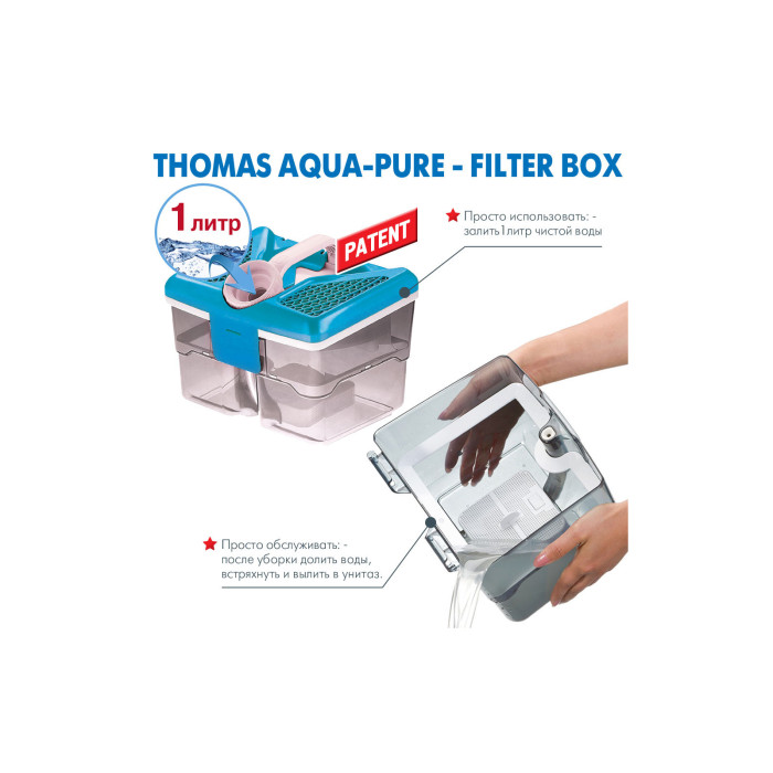 Пилосос THOMAS PERFECT AIR ALLERGY PURE (786-526) - це не просто звичайний пилосос, який виконує якісне і швидке прибирання, а справжнє досягнення німецьких інженерів. Даний пилосос в першу чергу призначається для людей, які страждають алергією на будь-яий пил, власникам домашніх тварин і для людей, хто хоче утримувати своє приміщення в ідеальній чистоті. Технологія з застосуванням циклонного контейнера вельми ефективна, але багатьом не подобається, що цей контейнер є розсадником бактерій і пилу. Тому в даній моделі пилососа застосовується зовсім нова безмішкова технологія AQUA-PURE-FILTERBOX, яка чудово затримує будь-які мікрочастинки пилу і очищає повітря в приміщення від запахів.