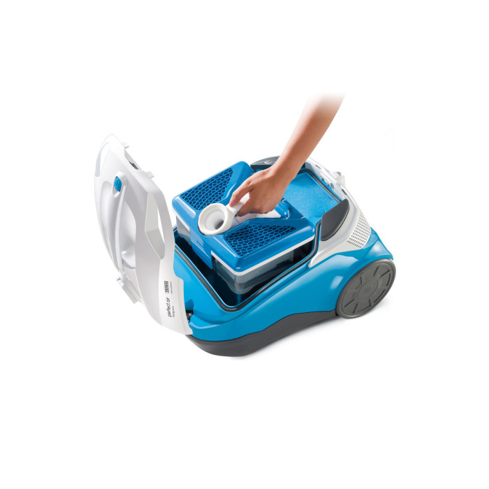 Пилосос THOMAS PERFECT AIR ALLERGY PURE має приємний і ергономічний зовнішній вигляд з поєднанням сріблястого і блакитного кольорів. Потужність максимального всмоктування становить 1700 Вт, що дає можливість робити легке прибирання всього приміщення та очищати повітря одночасно. Пилосос для вільного переміщення по кімнаті оснащений роликами з поворотом на 360 °. А шнур, який автозмотується, має довжину 8 м, що дозволяє проводити прибирання з радіусом до 11 метрів. Мається знімний резервуар з об'ємом 1,8 літра для всмоктування рідини в режимі збору води.