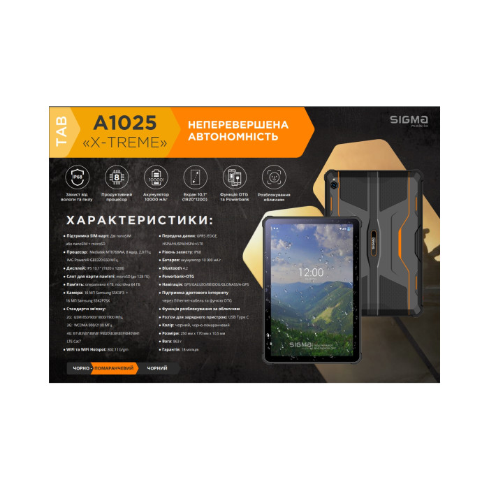 TAB A1025 X-treme оснащений найпотужнішою батареєю в історії компанії Sigma mobile. Її ємність — 10 000 мА*г, тобто майже на рівні з повербанками. Із таким акумулятором не страшно, якщо раптом вимкнуть світло вдома, чи якщо доведеться працювати прямо з планшета в кафе, в метро чи під час подорожі. Вам гарантовані довгі години геймінгу та безперервного перегляду улюблених серіалів із рідними, постійний зв’язок у месенджерах та серфинг в інтернеті.