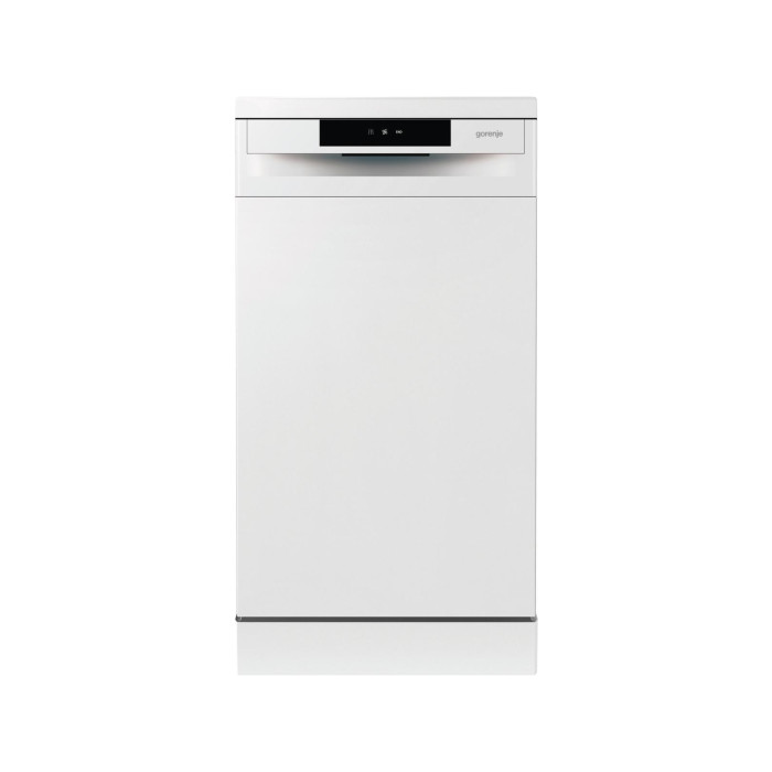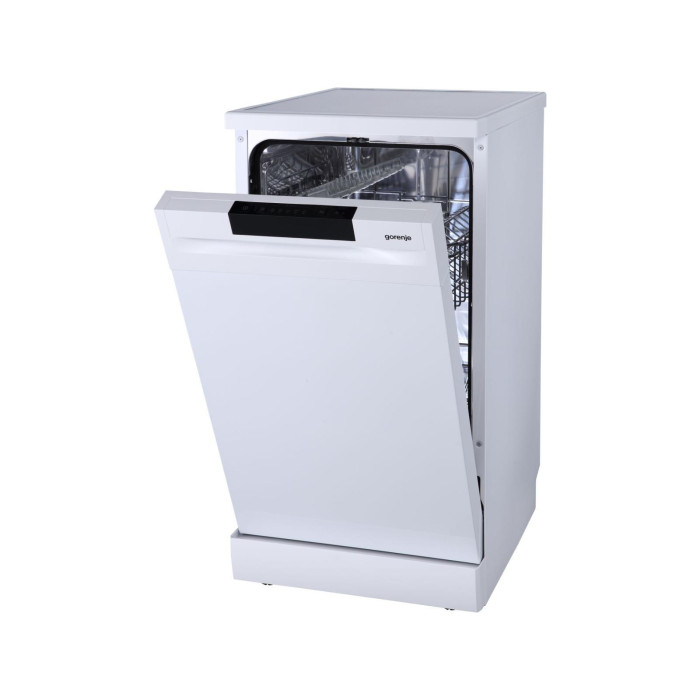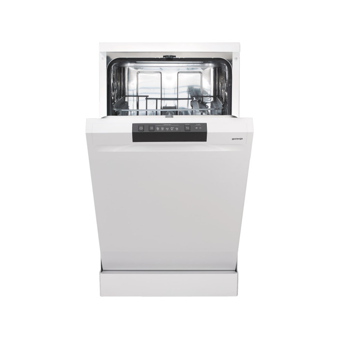 Посудомийна машина Gorenje GS520E15W вузька модель білого кольору. Верхній кошик регулюється за висотою для зручного розміщення посуду різних розмірів. Захист від протікання AquaStop запобігає затопленню в кімнаті, зберігаючи меблі та іншу техніку. Звуковий сигнал після завершення циклу підвищує зручність експлуатації