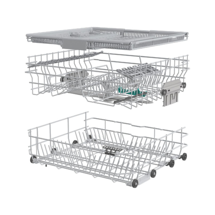 Система з трьох кошиків забезпечує неймовірну адаптованість до всіх потреб користувачів. Середній кошик оснащений шарикопідшипниками, що забезпечують найтихіший і плавний рух, який ви коли-небудь відчували. Регульована висота середнього кошика на 4 см з регульованим кошиком для столових приладів дозволяє вставляти та мити посуд різних розмірів та форм. Ця система із трьома кошиками дозволяє мити до 16 комплектів посуду одночасно