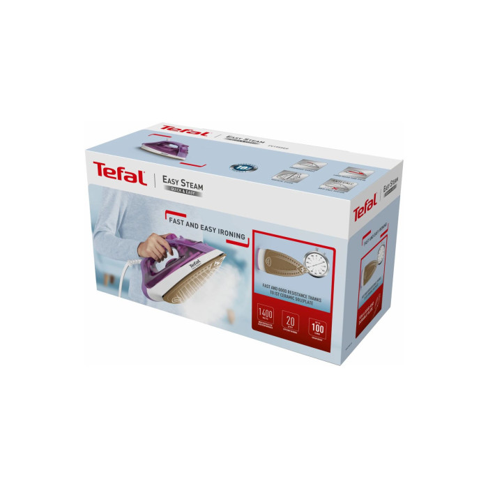 Праска Tefal Steam Essential FV1955E0. Парова праска Tefal Steam Essential FV1955E0 забезпечує більш плавне та легке прасування при кожному використанні, оснащена підошвою XL True Ceramic Glide для чудового ковзання та великою площею поверхні для максимальної ефективності. Особлива увага була приділена дизайну та виготовлення підошви. Гладкі краї разом з керамічним покриттям забезпечують надзвичайно легке ковзання. Точний наконечник для легкого доступу