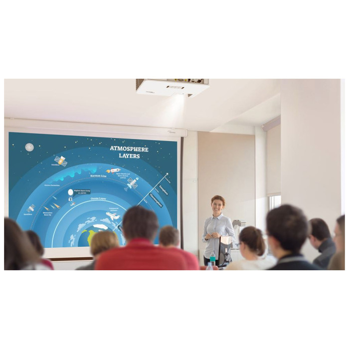 Компактний лазерний проєктор оснащений безліччю функцій, у тому числі має вбудований динамік, а також може працювати близько 30,000 годин при повній яскравості. Для максимального контролю проєктор оснащений роз'ємом RJ45, що дозволяє керувати мережею у кількох приміщеннях. Ідеально підходить для бізнесу, освітніх закладів, виставкових залів та музеїв, де потрібне чітке, яскраве зображення.