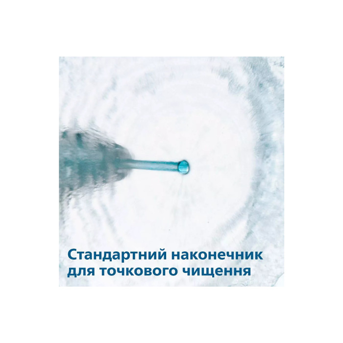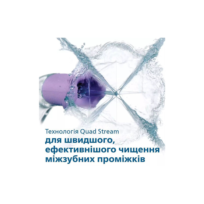 Ретельне чищення міжзубних проміжків для покращення стану ясен без зусиль. Унікальна хрестоподібна насадка з технологією Quad Stream охоплює максимальну площу міжзубних проміжків для більш ефективного та легкого очищення з меншими зусиллями. Унікальна хрестоподібна насадка Quad Stream очищає ефективніше завдяки хрестоподібному потоку води у чотирьох напрямках, охоплює максимальну площу міжзубних проміжків та ясен. Ніжні імпульси води сприяють чищенню і спрямовують вас від зуба до зуба в режимі ретельного чищення для завжди відмінного результату