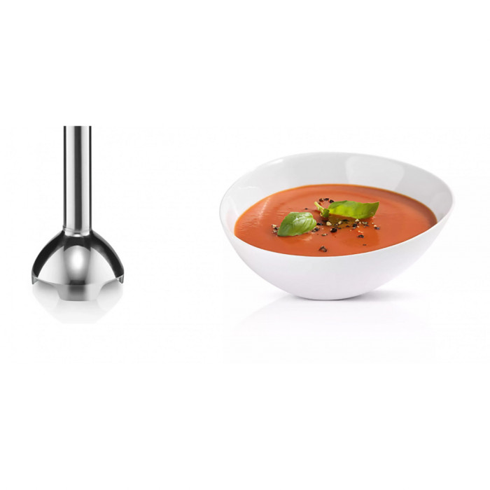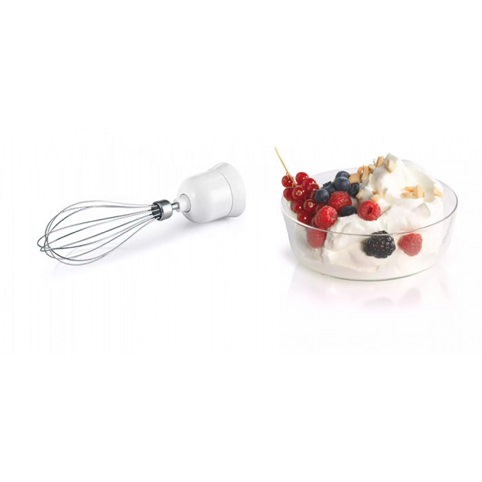 Венчик, ножка блендера — это те части, которые постоянно контактируют с продуктами, жидкостями, водой. Поэтому они изготовлены из нержавеющей стали. Это экологично, практично и обеспечивает долгую работу погружного блендера. Прибор позволяет при помощи венчика легко и быстро взбить белки, крем и т. п. Измельчитель в комплекта с чашей позволяет работать с зеленью, овощами, мясом, фруктами, сыром, орехами и т. д. Для удобства использования есть мерный стакан на 600 мл со шкалой.