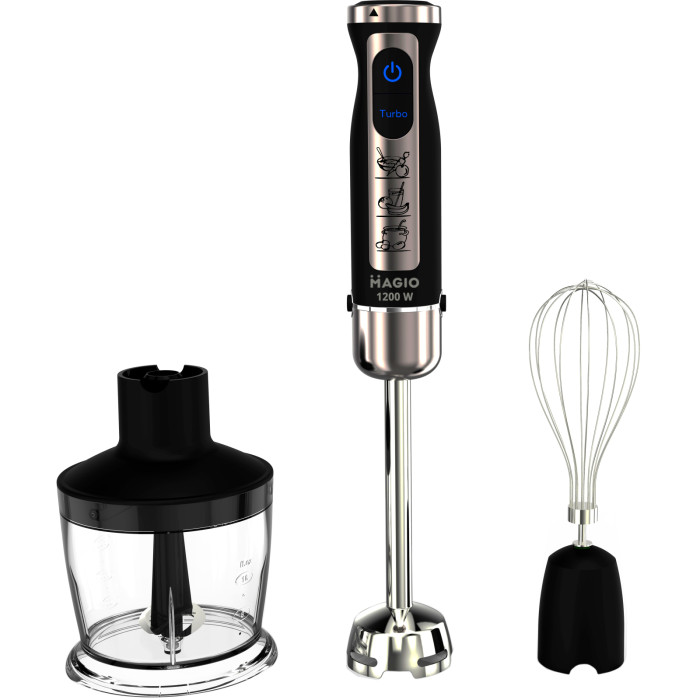 Блендерный набор MG-644 позволит вам разнообразить ваше меню и приготовить новый кулинарный шедевр. Мощность блендера составляет 1200 Вт, что обеспечивает бесшумную эффективную работу в течение длительного времени. Погружная часть и нож выполнены из нержавеющей стали — залог устойчивости к износу и долговечности. Эргономическая рукоятка с приятным покрытием SOFT TOUCH.