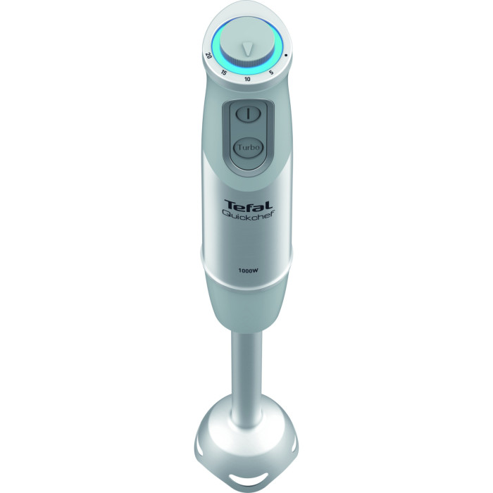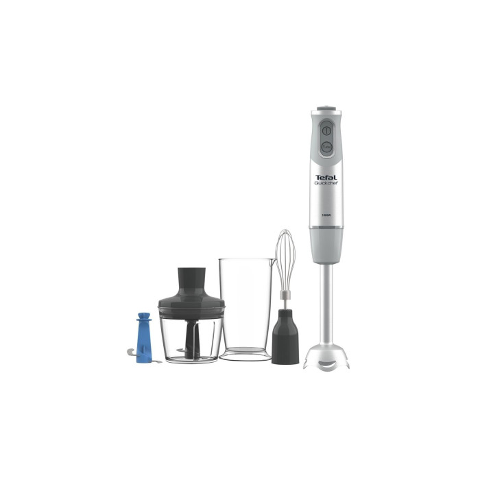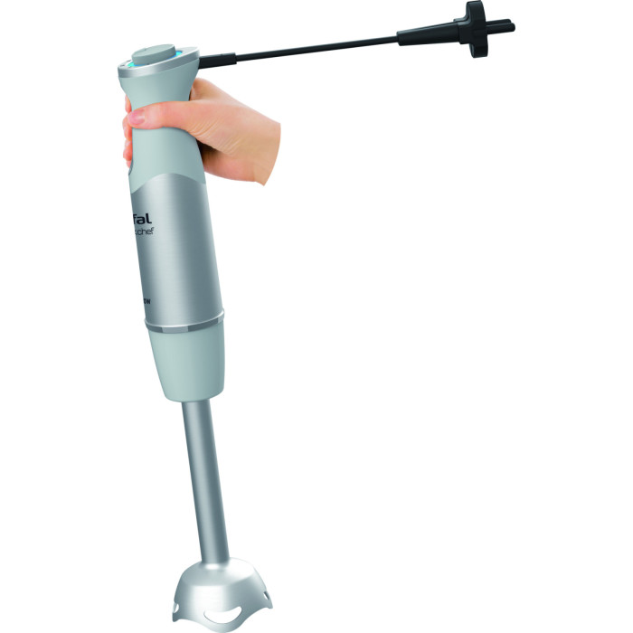 Металлическая погружная ножка. Погружной блендер Tefal HB65KD38 получил погружную ножку из металла, что обеспечивает ее прочность и надежность. Объем чаши составляет 500 мл. Чаша изготовлена из пластика. Объем мерного стакана составляет 800 мл. Среди насадок есть измельчитель и венчик.