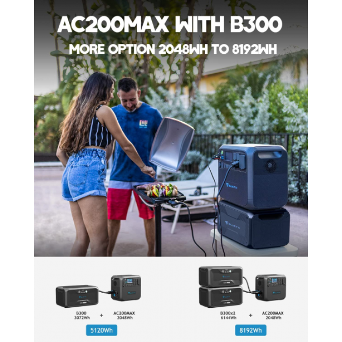 B300 не потеряет более 80% емкости 3072 Вт·ч за 3500 циклов перезарядки LifePO4-аккумулятора. Посредством такого модуля (или нескольких) можно значительно увеличить возможности станций питания AC200MAX, AC200P или AC300.