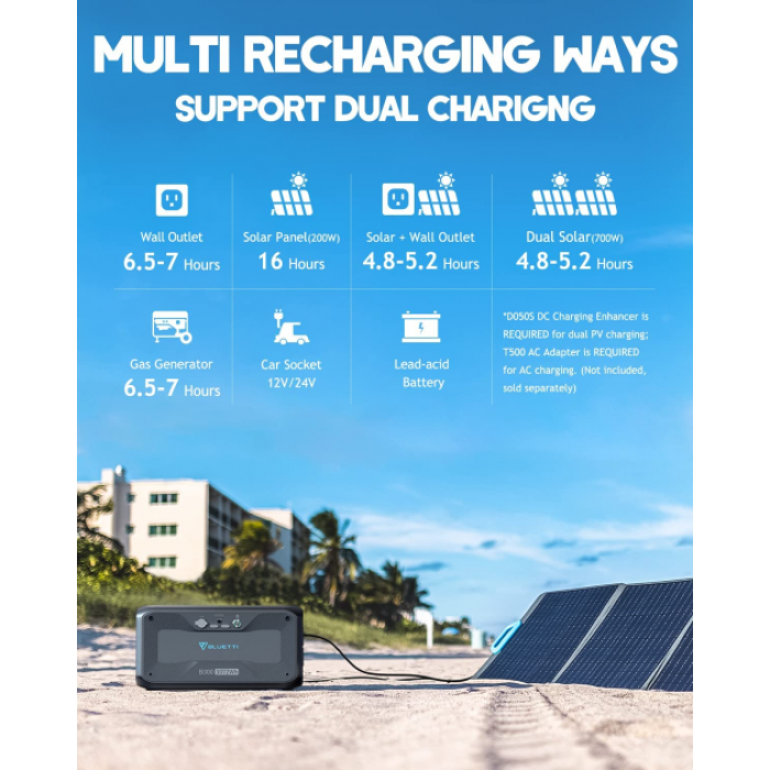 BLUETTI B300 благодаря встроенному контроллеру MPPT можно заряжать от 200 Вт солнечных панелей в дополнение к домашней розетке переменного тока, или (через дополнительный модуль D050S) – от автомобильного порта (прикуривателя) или свинцово-кислотного аккумулятора.