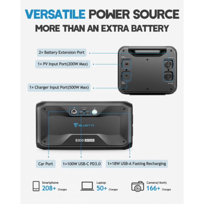 Модуль расширения для станций питания AC200MAX, AC200P и AC300 B300 можно использовать самостоятельно благодаря USB-C (100 Вт), автомобильному выходу 12 В/10 А и USB-A. Встроенный контроллер MPPT позволяет B300 быстро заряжаться от солнечной энергии с максимальной нагрузкой 200 Вт. Устройство можно заряжать от розетки, автомобильного прикуривателя или свинцово-кислотного аккумулятора.