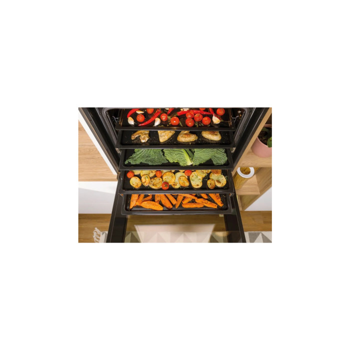 Сочетание продуманной системы циркуляции воздуха, равномерного распределения уровней приготовления и особой сводчатой формы духовки обеспечивает равномерное пропекание блюд на каждом уровне, а поскольку духовка большая, то и наблюдать за приготовлением на каждом уровне удобно.