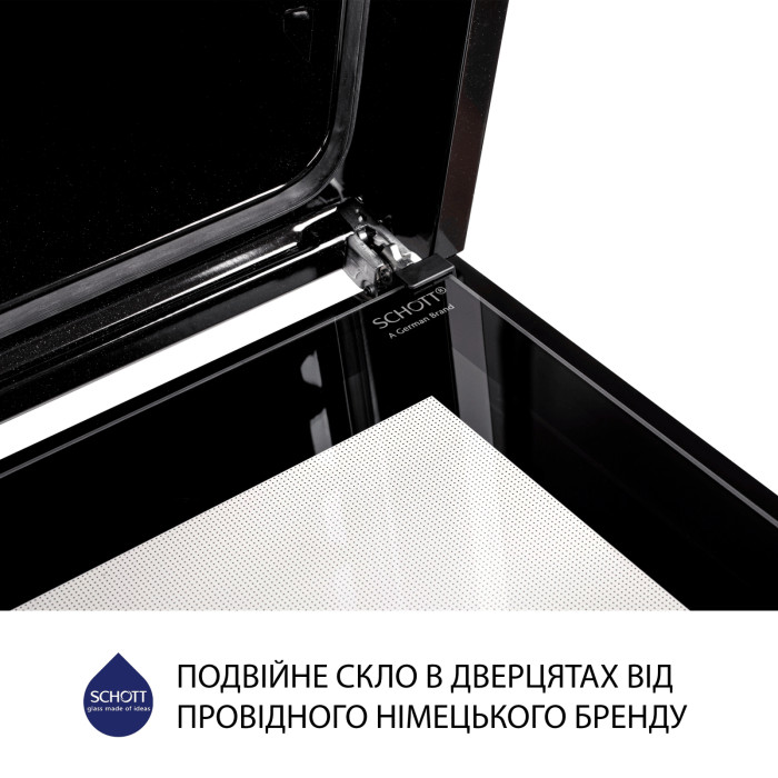 Дверца духового шкафа имеет двойное стекло от ведущего немецкого бренда Schott, которое обеспечивает эффективную изоляцию. Это позволяет сохранять тепло внутри камеры и снижать потребление электроэнергии. Кроме того, двойное стекло защищает вас от возможного ожога при прикосновении к дверце.
